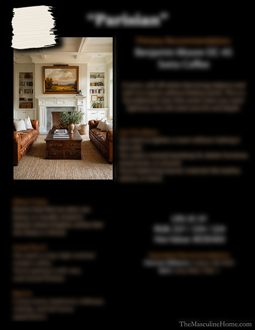 - Exact paint names + codes (Sherwin-Williams, Benjamin Moore, Behr)